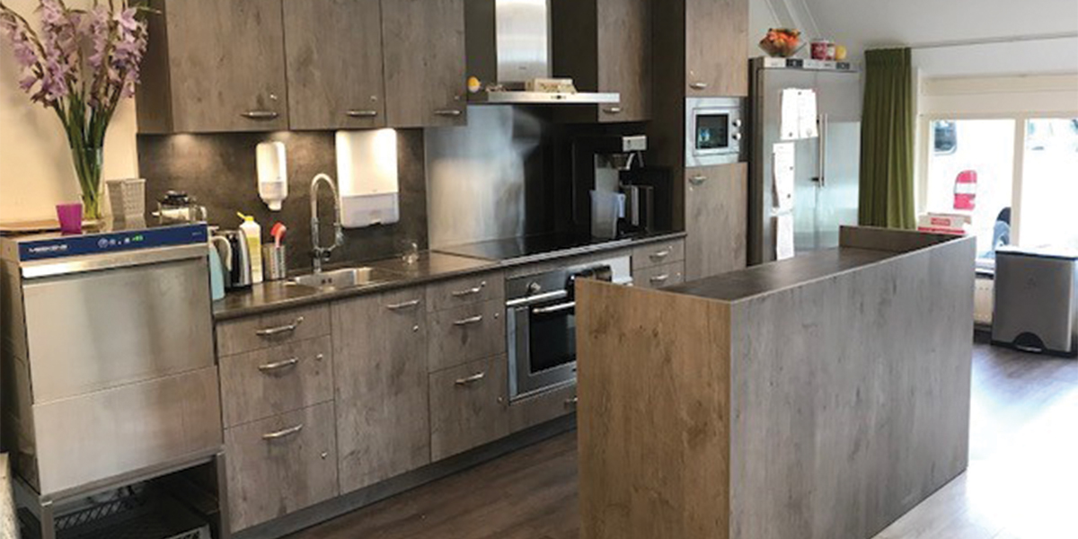 De Patio is een kleinschalige locatie voor ouderen met dementie en ouderen met een verstandelijke beperking met een intensieve zorgvraag. De door Meesterkeukens geleverde keuken is gesitueerd in het hart van de woonkamer.